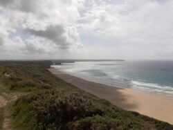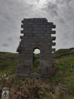 St Agnes to Gwithian today. Another quite long stretch, 13 or 14 miles and more rain and wind in the afternoon again. This isn’t what I signed up for… Fuelled up on a full English at the Driftward Spars I make good time to Chapel Porth and Porthtowan, two renowned heavy wave spots on this coastline. The last time I paddled a board out at Porthtowan it was snapped in half by a wave. The swell is much bigger today, and I watch some guys catching a few overhead waves as I have a coffee in the beach cafe. There is loads of mining history in the landscape now. Shafts and excavations capped off with metal frames resembling witches hats, and the iconic old Wheal workings. I pass one that looks like a set from Poldark. No Demelza around though, sadly, although a guy does tell me he spotted a chough earlier. Lunch in Portreath and then a long clifftop section where the rain starts up again. Not quite as biblical in its intensity as yesterday, but equally as wet. It rains right into Gwithian, where I am forced to take shelter in the pub for a couple of hours. Eventually it passes over and I pitch up at Gwithian Farm campsite for the night.