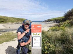 Definitely a walk of two halves today Crantock to Perranporth is ok. I meet with Emma and we crack on through dunes and low cliff paths, in the sunshine. We have a snack at the northern end of Perranporth beach, and you can see the forecast rain and high wind approaching. We get the waterproofs on asap.