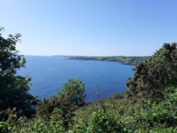 A pizza on the campsite, 2 Belgian beers and 10 hours sleep, and I feel like the energiser bunny this morning. Around Dodman Point, early in today’s walk I meet a youngish couple with the woman carrying a dog in backpack. It’s one of those Cocker-doodle-shita-poo crosses, with a bow tied between his ears. I wonder if he’s thinking ‘10,000 years ago I would have been a proud member of a wolfpack, running down caribou and deer across the tundra and forests of Northern Europe, and now I’ve evolved to being carried by an odd human along the SW coast path with a ribbon tied round my head ‘ Probably not, he’s probably just thinking ‘Eazzzy Life!!‘ Karma gets its own back 10 minutes later when I’m confronted by a snarling, muzzled land-shark of a dog, who looks like he’d be happier working crowd control at a West Ham v Millwall derby. I retreat behind a kissing gate until the owner gets him reined in. ‘Don’t worry, he’s a rescue dog and just has a problem with blokes with sticks‘ he tells me. ‘His bark is much worse than his bite” I want to say 2 things; Firstly, I’m glad of the poles, as they represent my sole form of defence against such a creature. Secondly, even if his bite is a mere 10% as bad as his bark, if he gets that muzzle off, I don’t want to be any part of it. Instead I mumble something about dogs not really liking me much, and crack on.