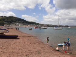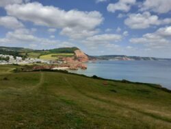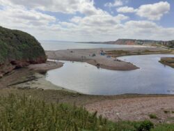 Some familiar places and poignant memories in todays walk. I’m away from The MT Wallit Campsite at 8am as I am determined to get the first ferry over to Exmouth at 10.10am, and I don’t know how long the walk to the ferry pier will take. Turns out it’s an hour, so I have plenty of time. 10.10am seems a late starting time for a ferry service, but I guess we are still on Devon Mean Time down here. As expected I bump into Ian and Helen who have exactly the same thought as me. We are the first 3 on the boat, and it’s a pleasant trip across the estuary to Exmouth. A shortish walk along the promenade and up an incline brings us to Sandy Bay holiday park. My Aunt and Uncle from Sidmouth once owned a static caravan here, bought just so members of the family could use it. We had 4 years or so of use during the Whitsun half term holidays, kayaking, walking and going to the beach. Good memories.