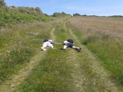 I leave today on the final few days stretch from Weymouth to Studland. Its critical to get through the army firing ranges between Lulworth and Kimmeridge before the end of Sunday, or else they are closed for the week. Why they can’t practice blowing up and shooting things in some other part of the country which isn’t crossed by a world famous long distance footpath I really can’t figure out. I’m joined by Steph and Anna, two friends of Sarah. Anna has a dog and is cycling the route. We catch up with her struggling up a hill just outside Bowleaze Cove. Its an unusual way of doing it…the downhill parts look OK though. Dexter the Dog seems to like me which is an unexpected bonus. I reach the campsite for tonight and pitch up. Its earlier in the route than I thought and get the tent up before the forecast rain arrives. A meal in the Smugglers pub at Osmington mills and its an early night ready for a long one tomorrow.