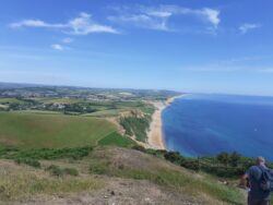 The walk into Beer is spectacular, along the top of Beer Head cliff. I spot the outline of Portland on the Eastern horizon, familiar to me from many walks on Chesil Beach and the Purbecks, and it dawns on me how close to finishing I now am. Beer has nice feel, and then it’s a shingle beach walk on into Seaton where I stop for an early lunch/second breakfast of chicken and chips. I share the table with a family – baby, parents and grandparents. The older lady asks me where I’ve walked from and I reply “Minehead” , to which she says “what, this morning?” I realise that maybe Geography wasn’t her strongest subject at school.