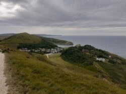 Osmington to Kimmeridge Bay today. Through the range walks in the nick of time. Up early and walking by 8:30 am. Its a long stretch today, 15 miles or so, with a lot of ascents and descents around Lulworth, up over Mupe Bay and again up from Worbarrow Bay. Huge chalk cliffs and views inland over the ranges and across to Tyneham make the climbs worthwhile. Tyneham Deserted Village is worth a mention. It was requisitioned by the MOD during WW2 for training purposes, and all the villagers were relocated elsewhere, but were told they could return at the end of the war. However, the MOD changed their mind and kept the village and ranges land, and the owners were never able to move back in. Now it’s a kind of frozen in time ghost town. Kimmeridge Bay arrives at last, and the coffee van there has never looked as welcoming. A cab the final 2 miles to the campsite which is well off the coast route makes things a bit easier. I’m actually starting to get the hang of pitching my tent and sleeping comfortably in it now, so that’s progress.