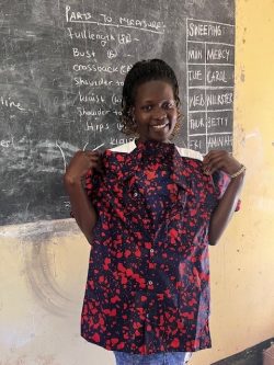 Two years passed, during which Beatrice grew her business, in spite of a global pandemic. When we visited Beatrice again in 2021, she had employed another tailor, and taken on two apprentices. She told us, “I feel very happy and proud of myself.”