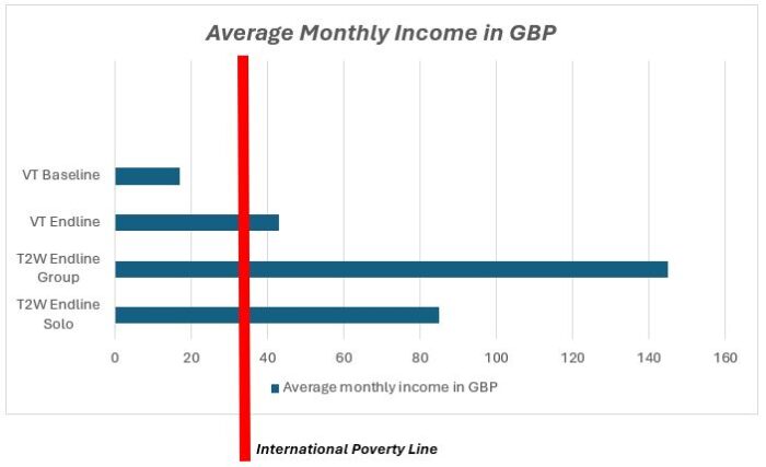 From their initial vocational training (which began in 2022) to reaching the end of their Transition to Work project, all graduates reported increased earnings, crossing the International poverty line. The average income of Transition to Work graduates working in business groups was: 450,000 -1,000,000 UGX /month. For graduates working alone, the average income was 350,000 – 500,000 UGX per month. The equivalent earnings in Pounds Stirling are represented below.